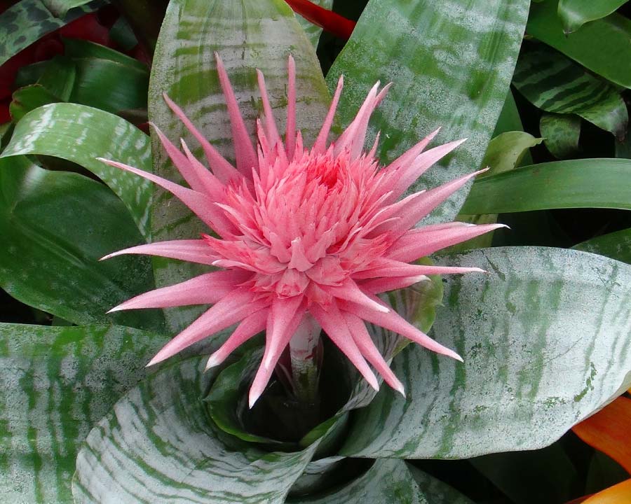 A majestic pink flower emerges from the silver/grey/green 'vase' of the Aechmea’s rosette.