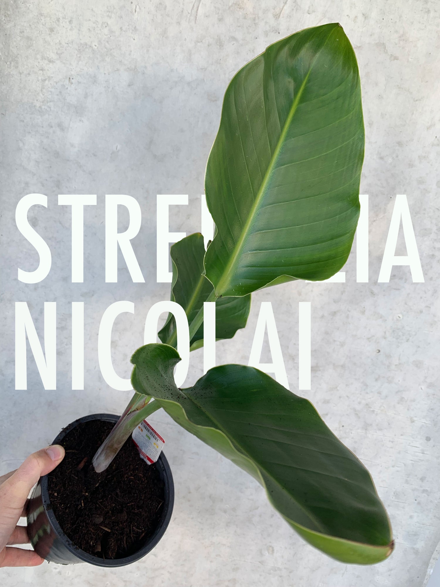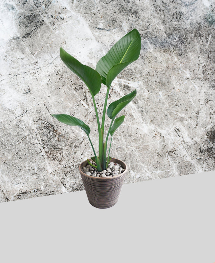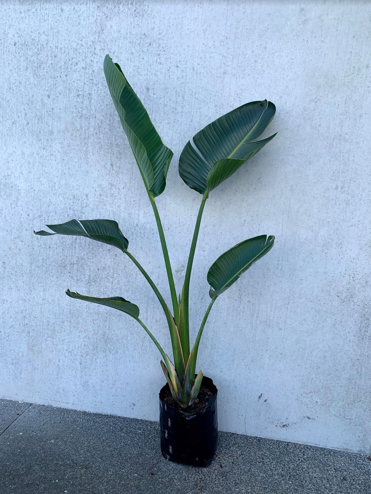 A large banana-like leaf plant with white flowers that resemble a bird in shape. Requires little attention, water when soil becomes dry. Water more frequently in summer for faster growth.